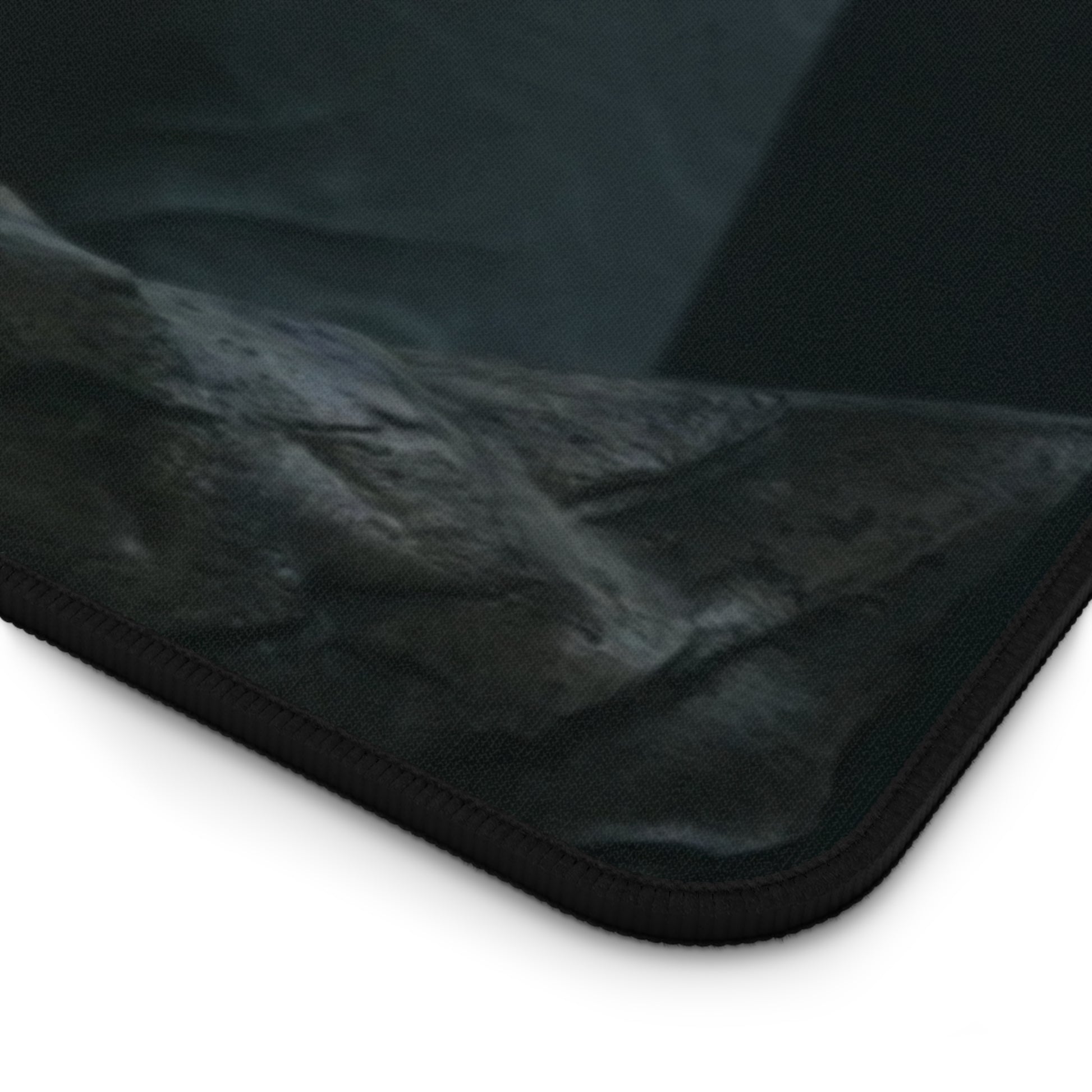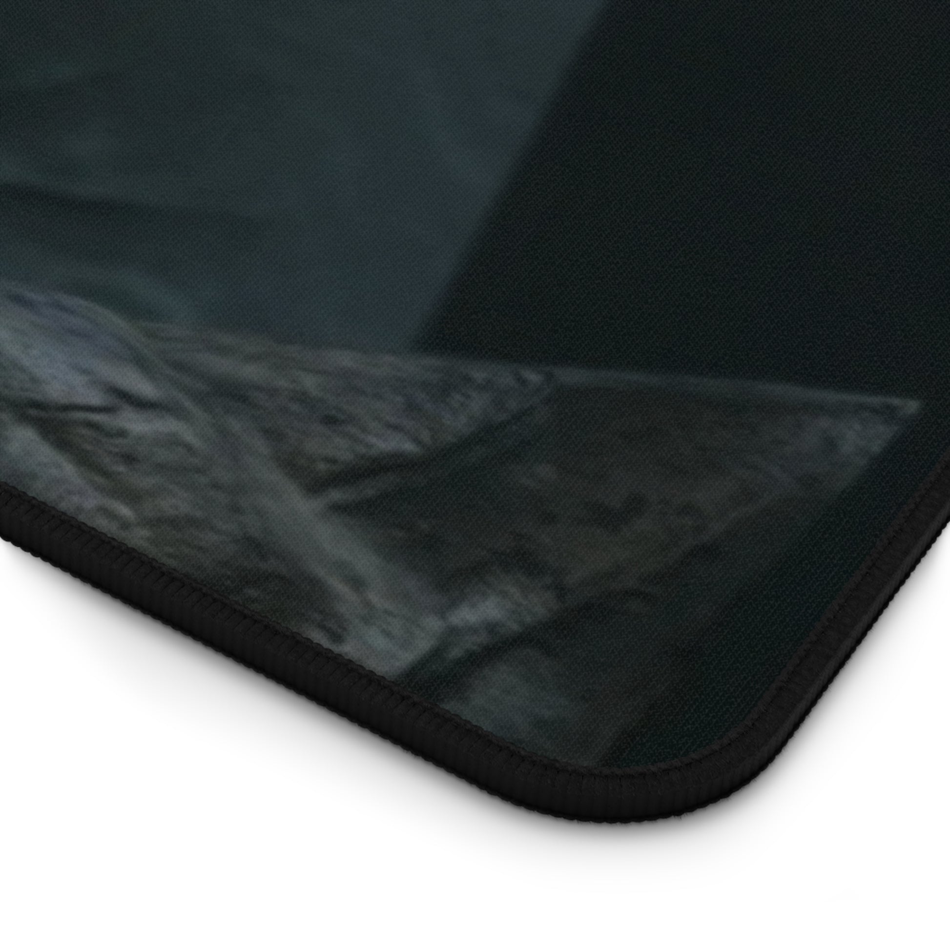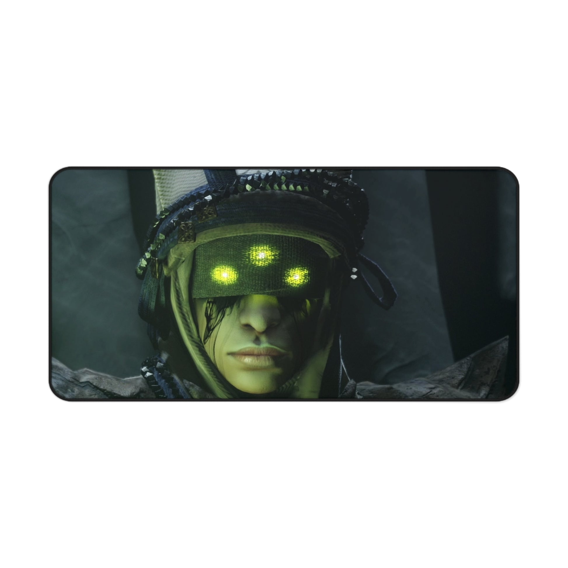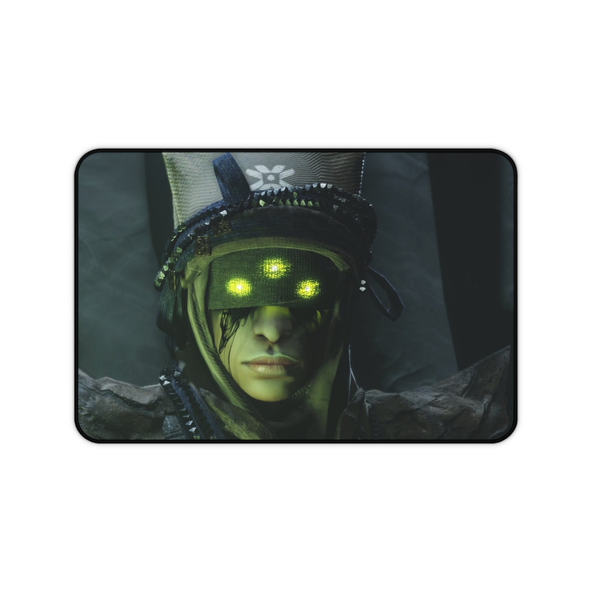A dark, atmospheric desk mat that turns your workspace into a moody command center. Deep greens and shadowed details draw the eye to the eerie figure at its center — a tactical, neon-eyed character that feels equal parts cyberpunk reconnaissance and forest spirit. The neoprene surface gives a smooth, supportive plane for mousing, writing, or late-night sketching, while the stitched edges and anti-slip backing stand up to heavy use. This mat makes a focused, immersive backdrop for gamers, digital artists, and anyone who prefers a workspace with personality and edge.